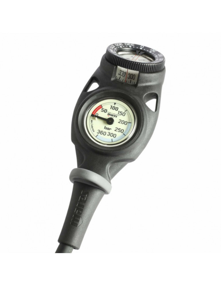 Sie umfasst das Manometer, das für einen Druck von 300 bar geeignet und in ein stoßfestes Kunststoffgehäuse integriert ist, sowie den Kompass.