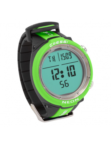 Neon has a diameter of only 48 mm and a high contrast display of 37 mm. It is a scuba diving/ apnea watch-computer of extremely reduced dimensions. It is also an ideal watch for other underwater activities, thanks to the deactivation option of the “dive” functions that avoids unnecessary alarms ringing while you’re snorkeling or swimming. The display is made of mineral glass and the case is heavy duty with steel buttons that have an underwater resistance of up to 120 m. Ptu rubber wrist band with stainless steel buckle
