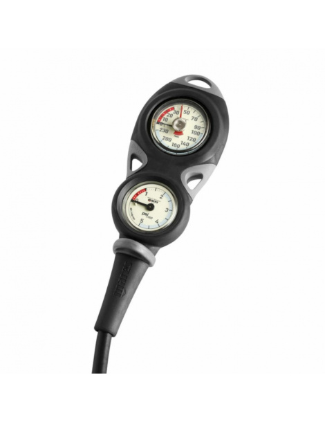 The Mission 2 console is impressive due to its slim, ergonomic design and is fitted with four eyelets to be attached to the jacket. It includes the manometer suitable for a pressure of 300 bar and integrated in a shockproof plastic case. The depth gauge has a towed hand that displays the maximum depth reached during a dive. The case is designed so that the new Puck computer can be easily inserted in place of the depth gauge in the event of a subsequent upgrade.